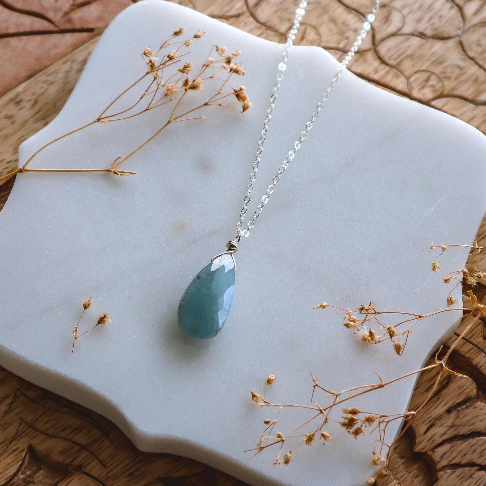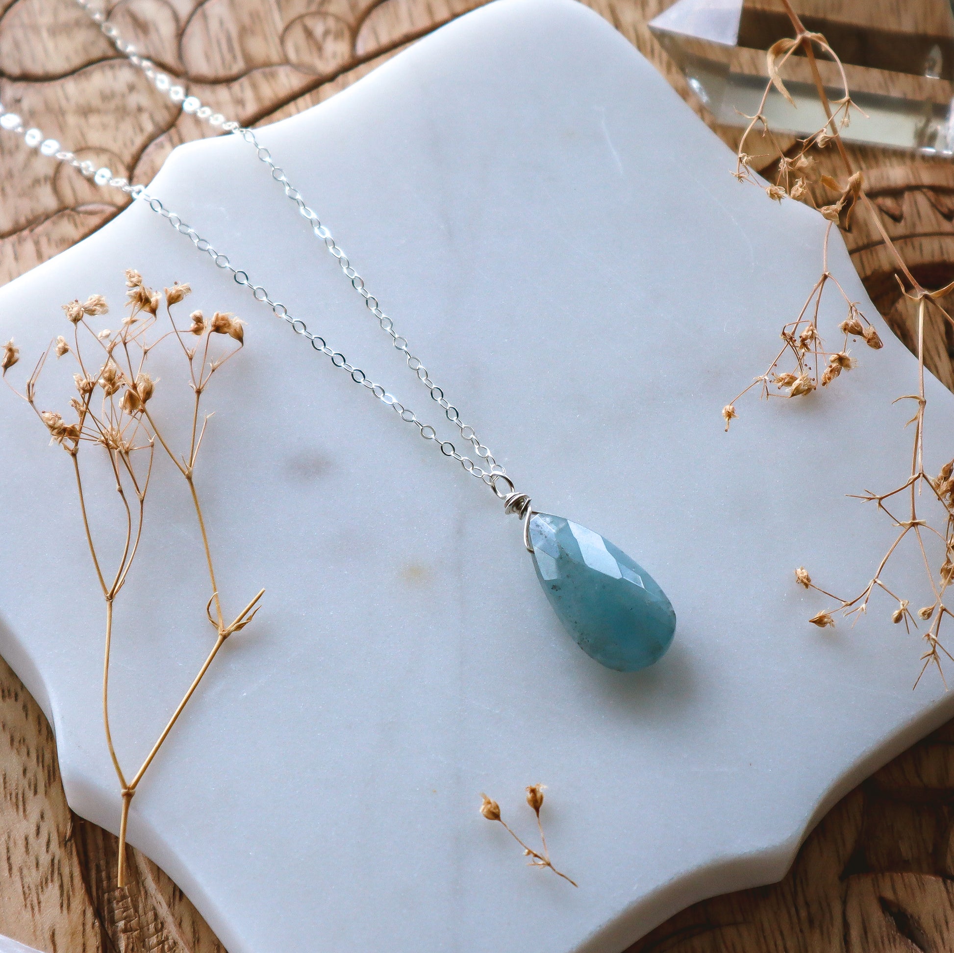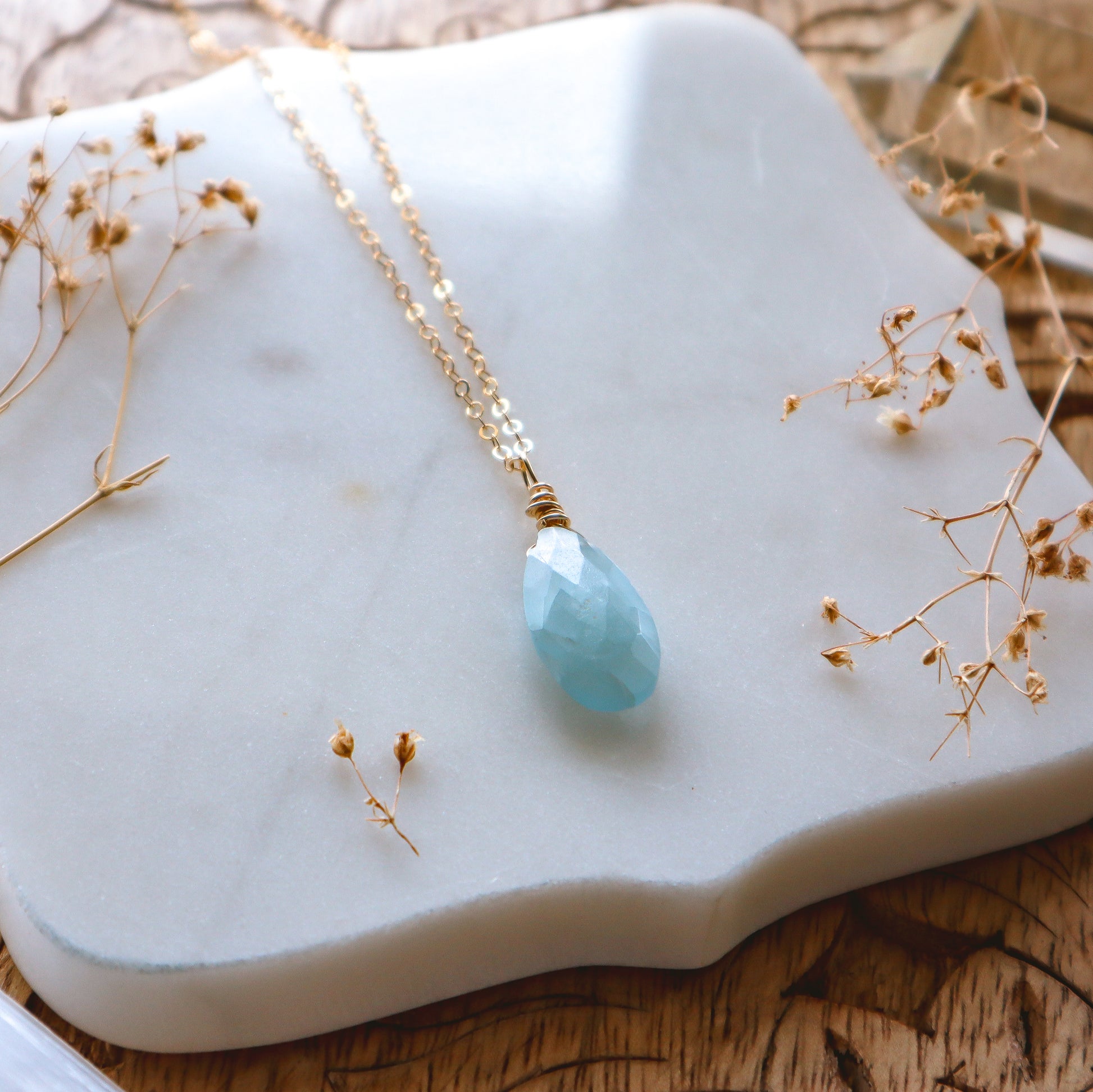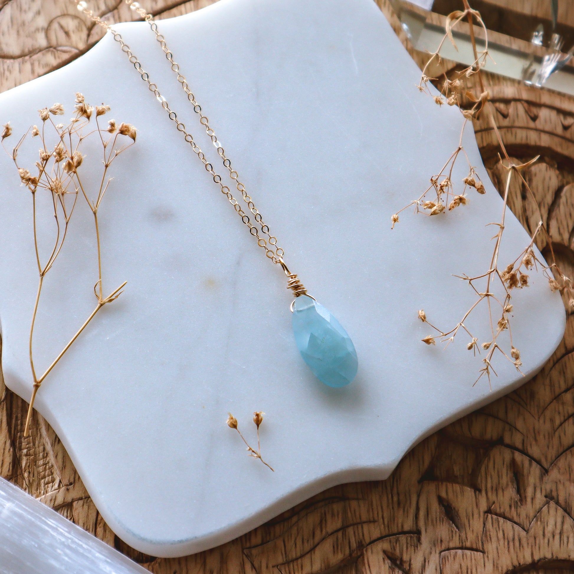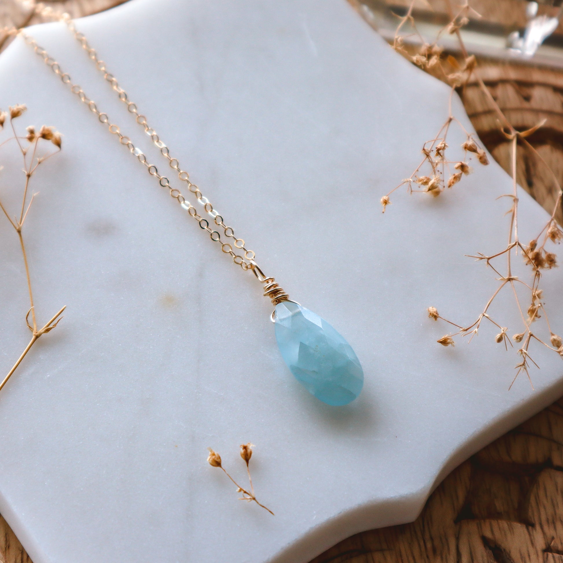 Beautiful, aquamarine teardrops on dainty chain. Chose your length and metal (sterling silver, gold-filled, or rose gold-filled). Closes with a lobster clasp in the back. The drops dangle about 25-30mm from the chain.
