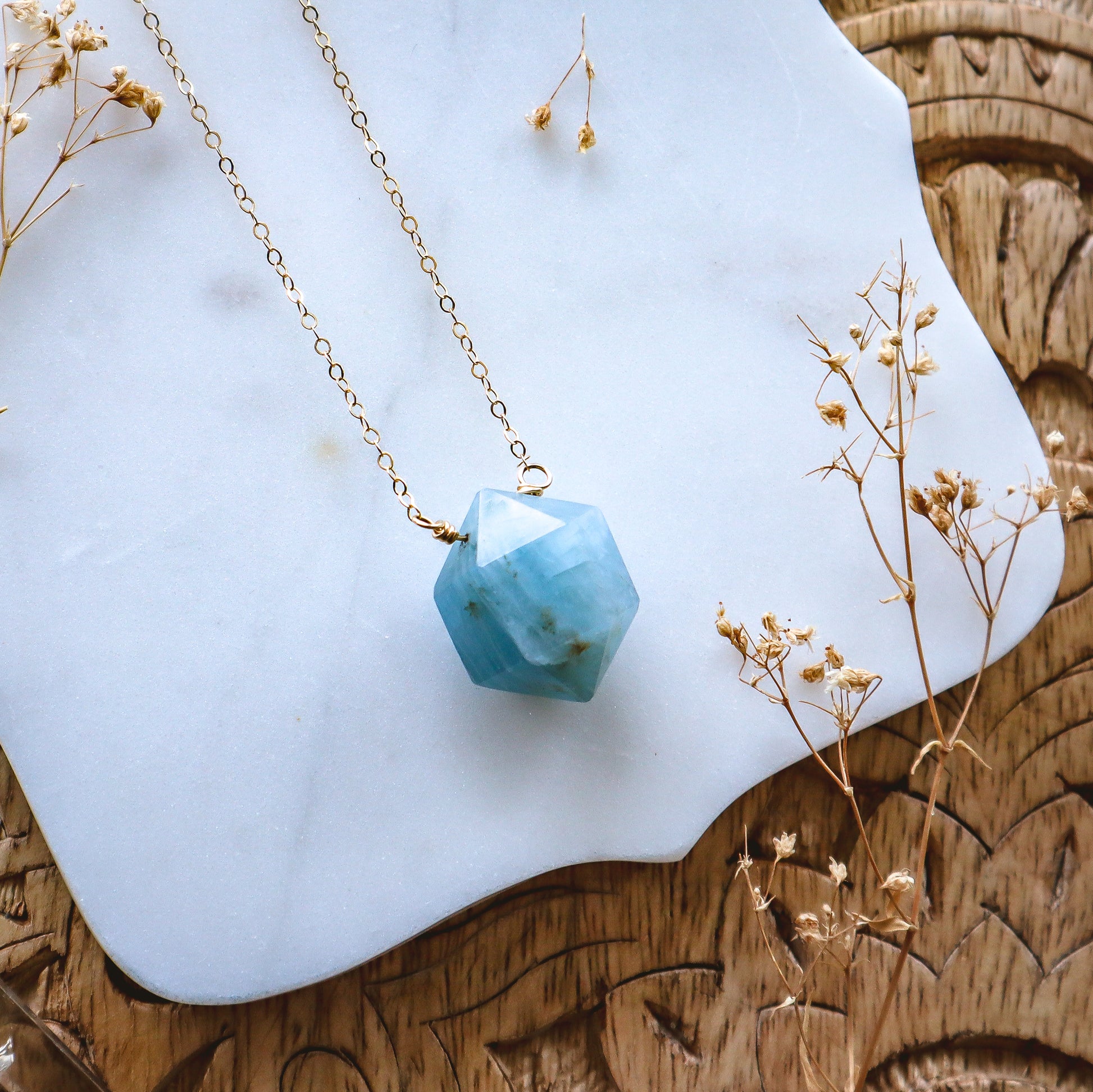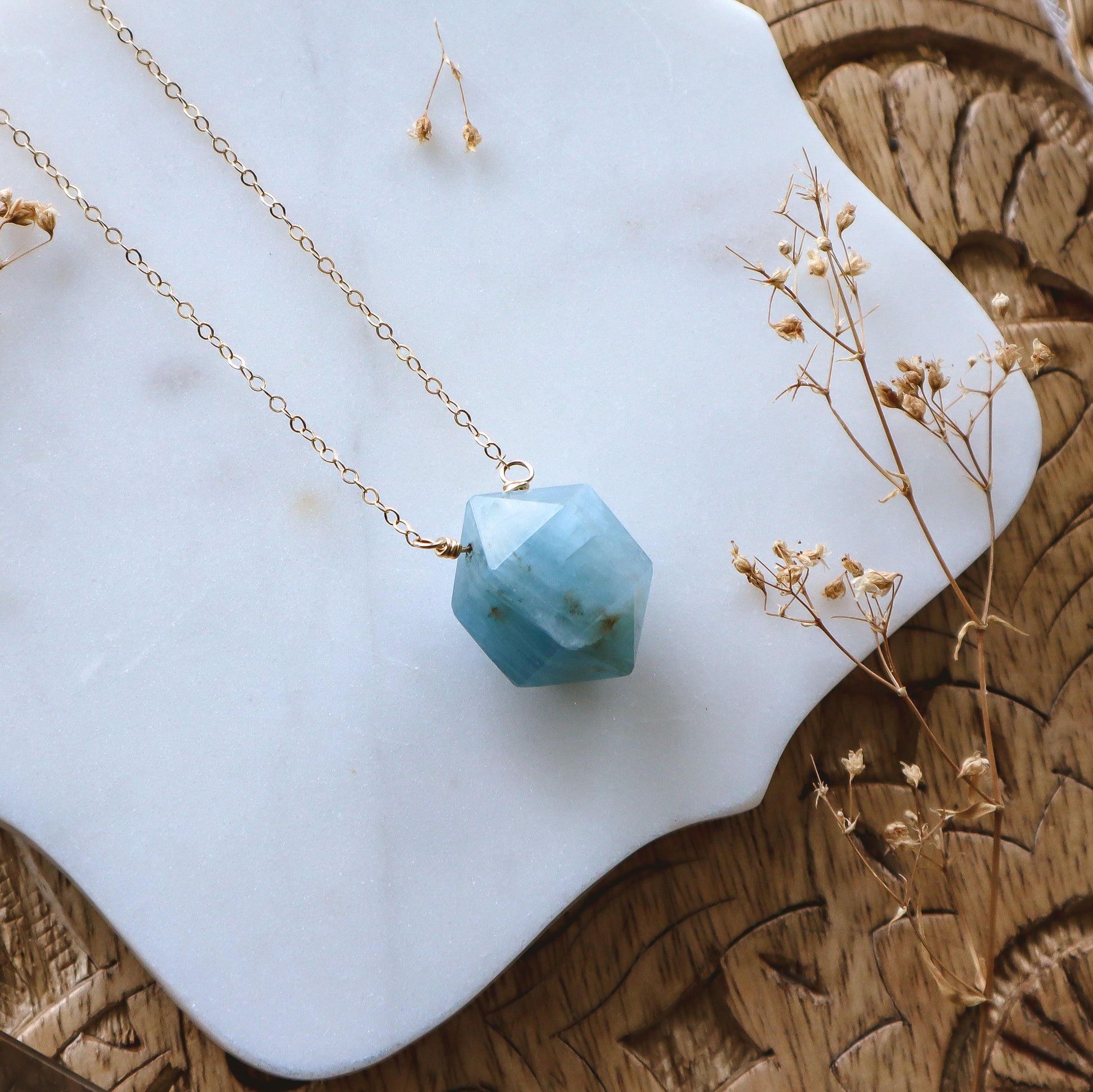 Gorgeous, chunky aquamarine diamond on dainty chain. These beauties were custom-made just for Aurora Moon Creations. They have been cut into a faceted, double-terminated shape.