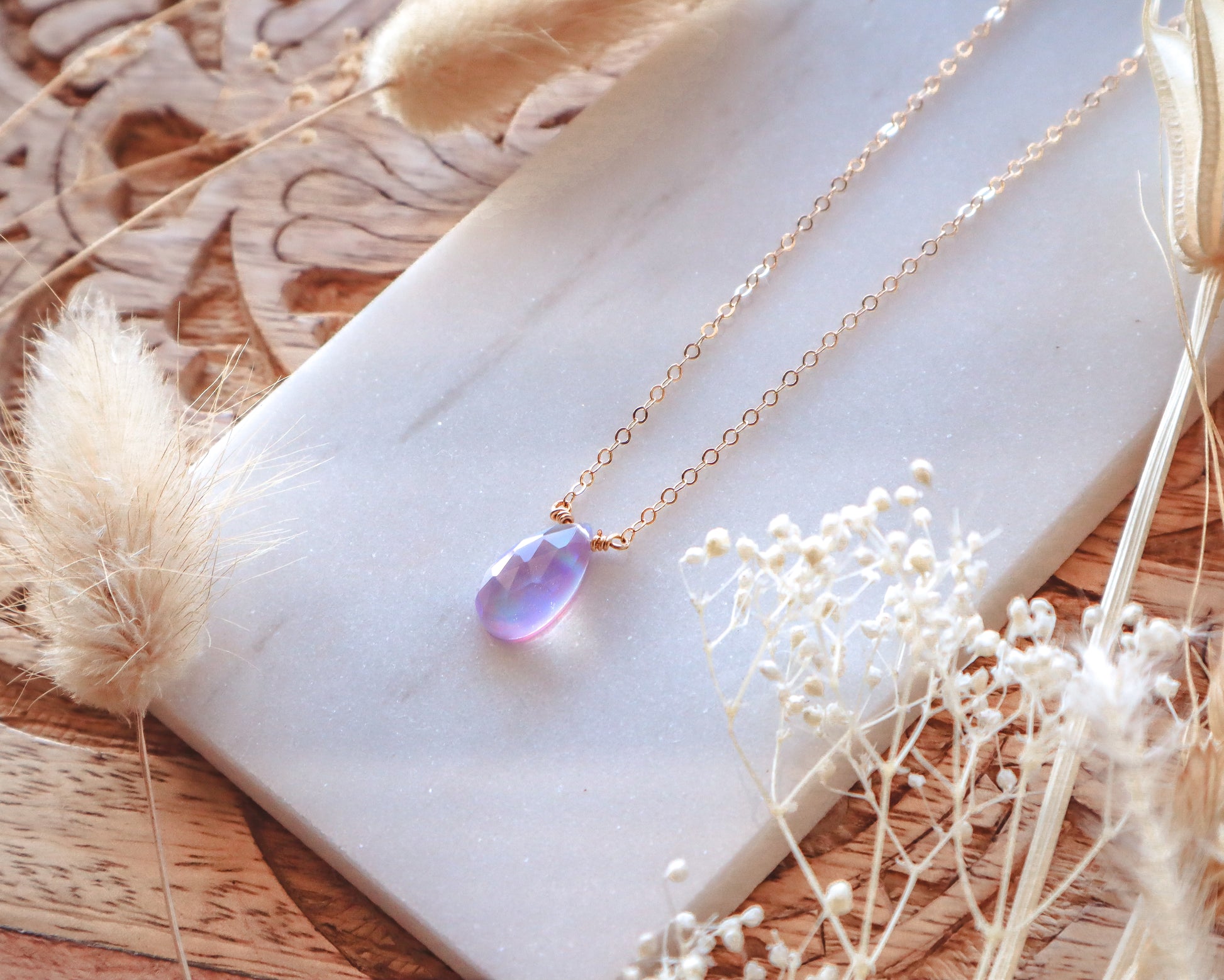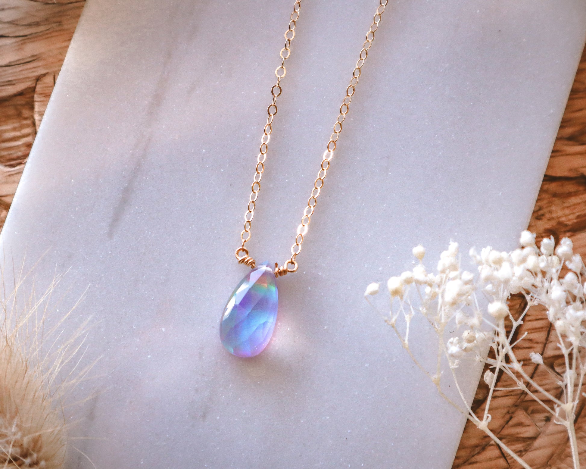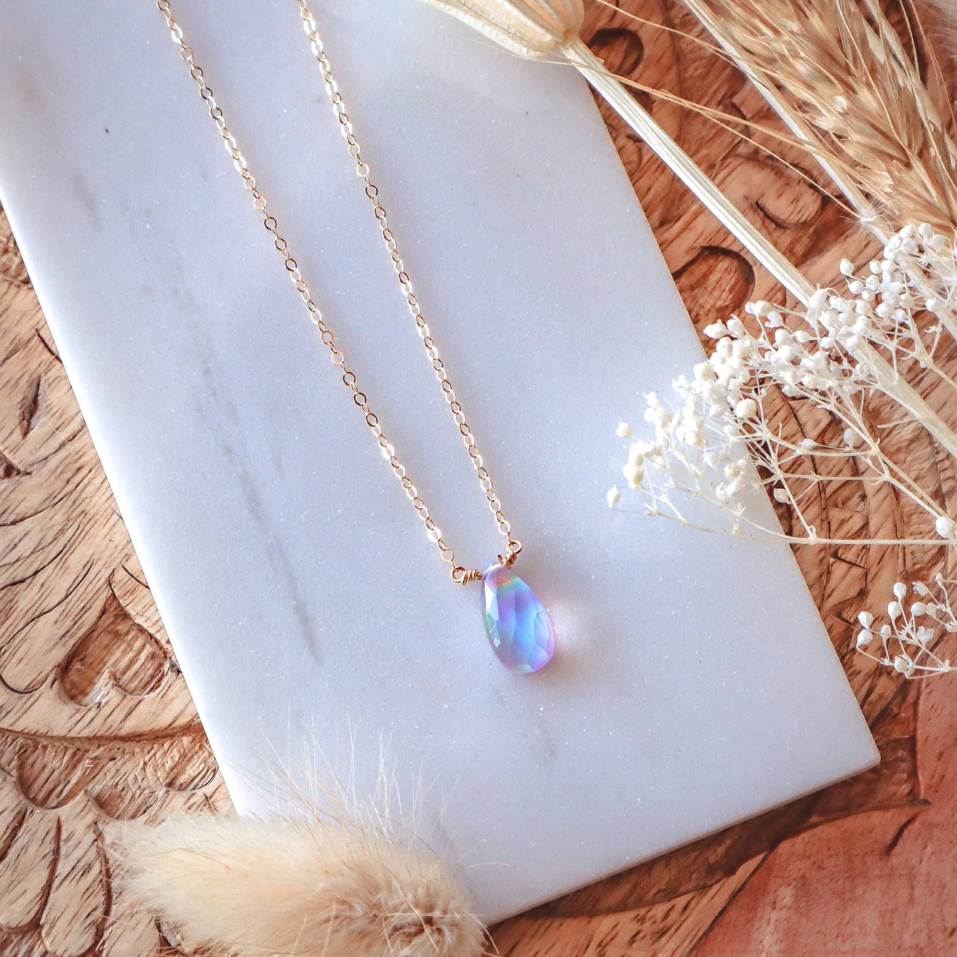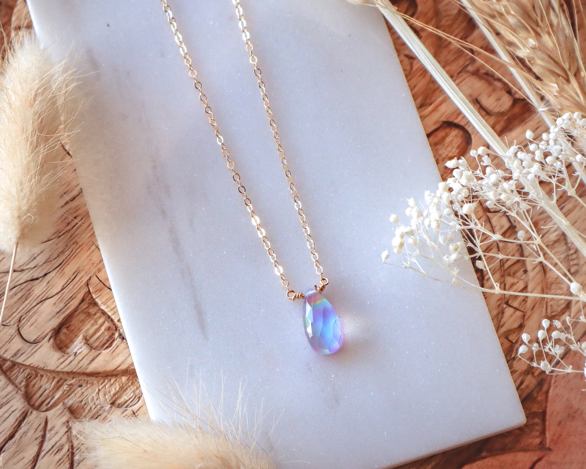 Allow in your positivity and uniqueness with these one-of-a-kind, 16" necklaces ✨ Featuring an aurora opal (manmade)/clear quartz doublet on dainty chain. A doublet means that two gemstones have been put together to make one. In this case, the aurora opal is on bottom, with clear quartz on top.
