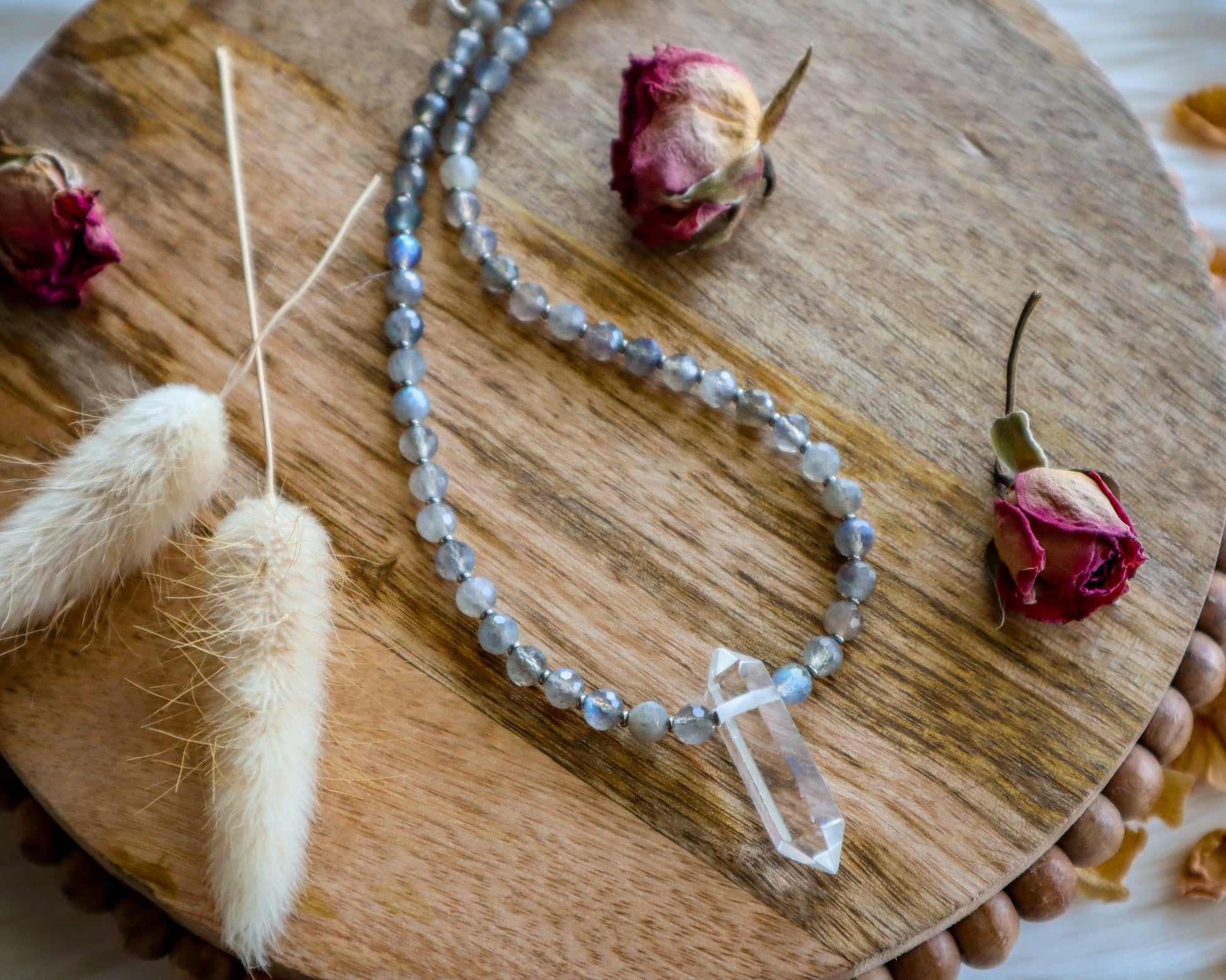 Double-terminated clear quartz pendant + 6mm high-quality, faceted labradorite beads. These beads have high sparkle and brilliant flash! Finished with a silver lobster clasp and extender chain.
