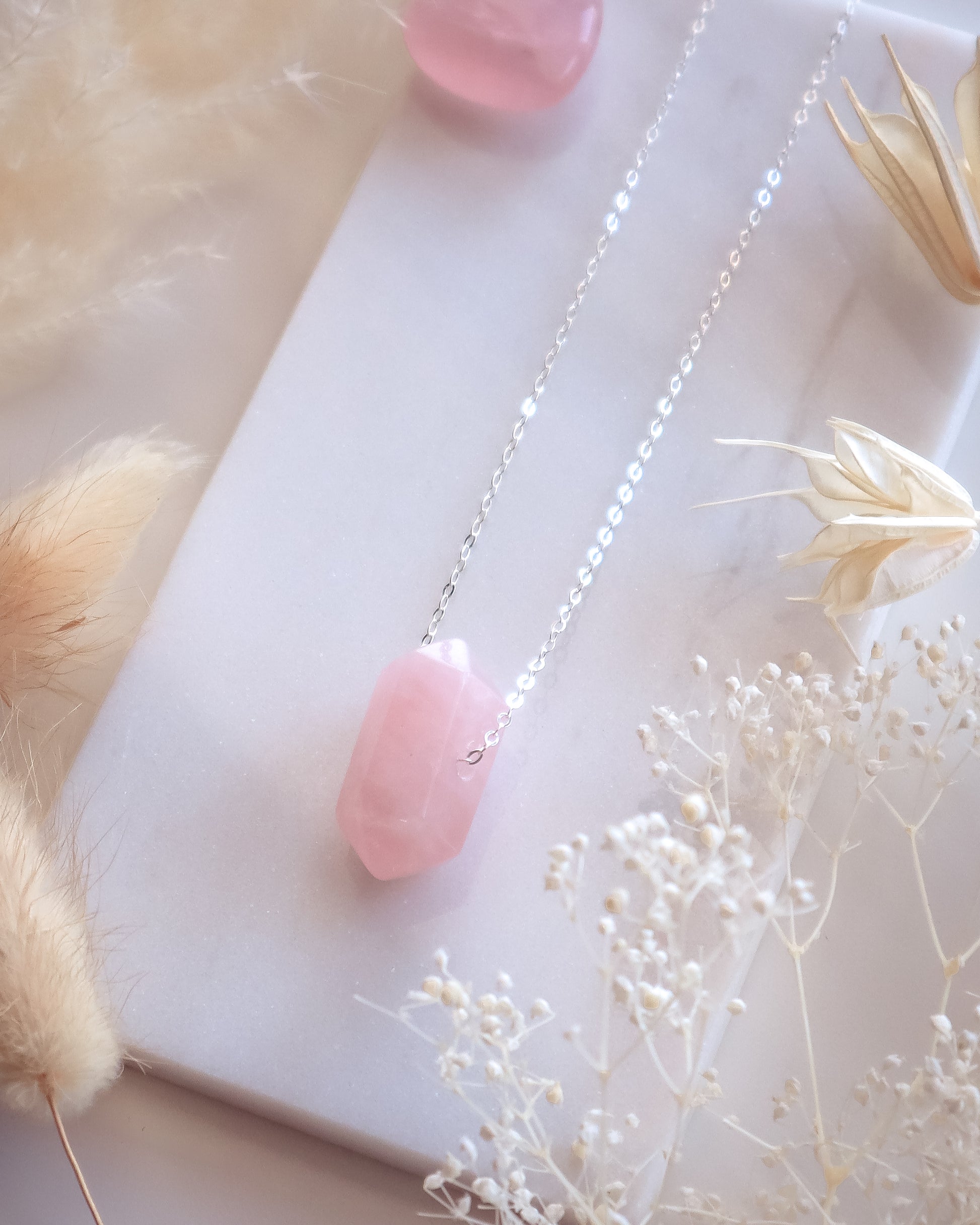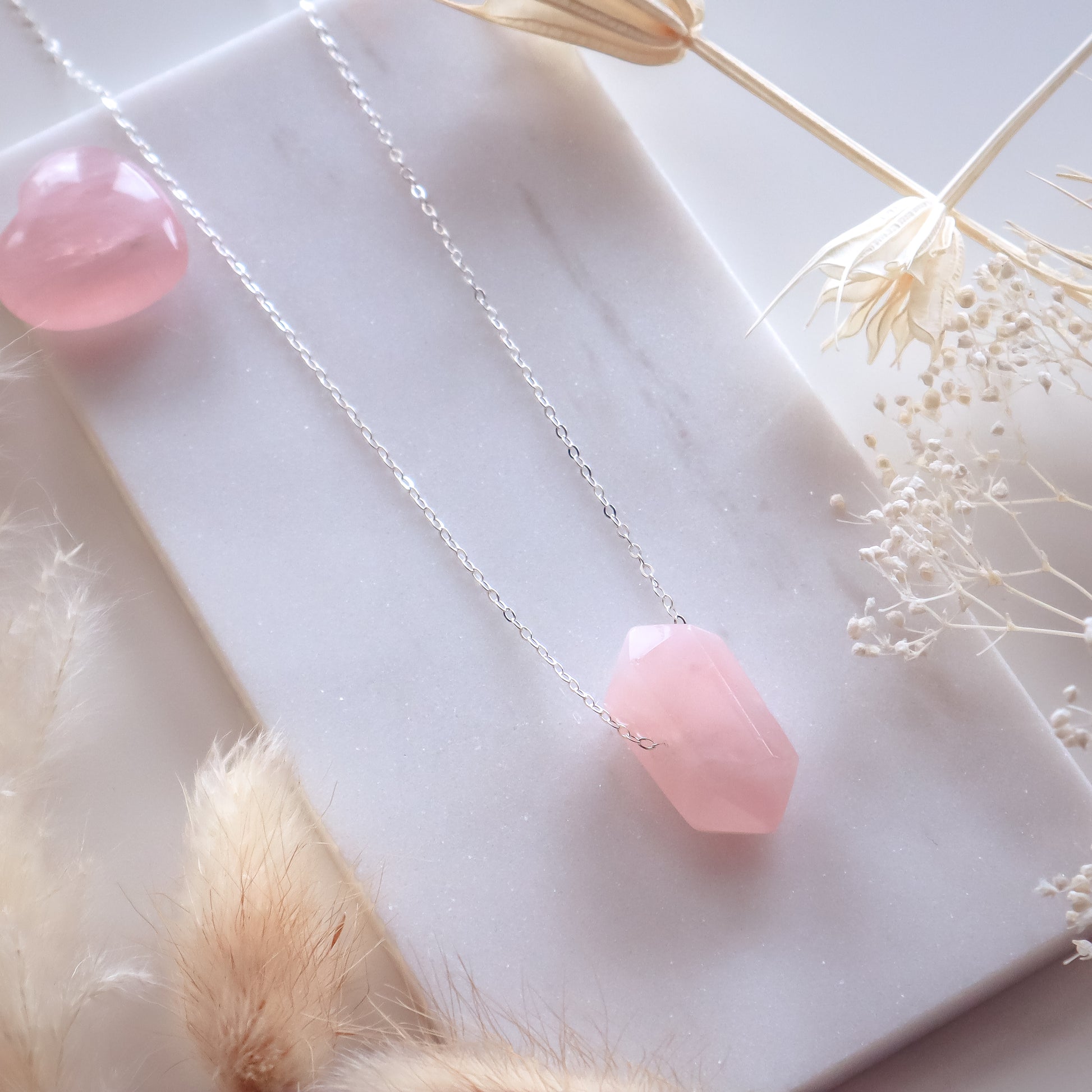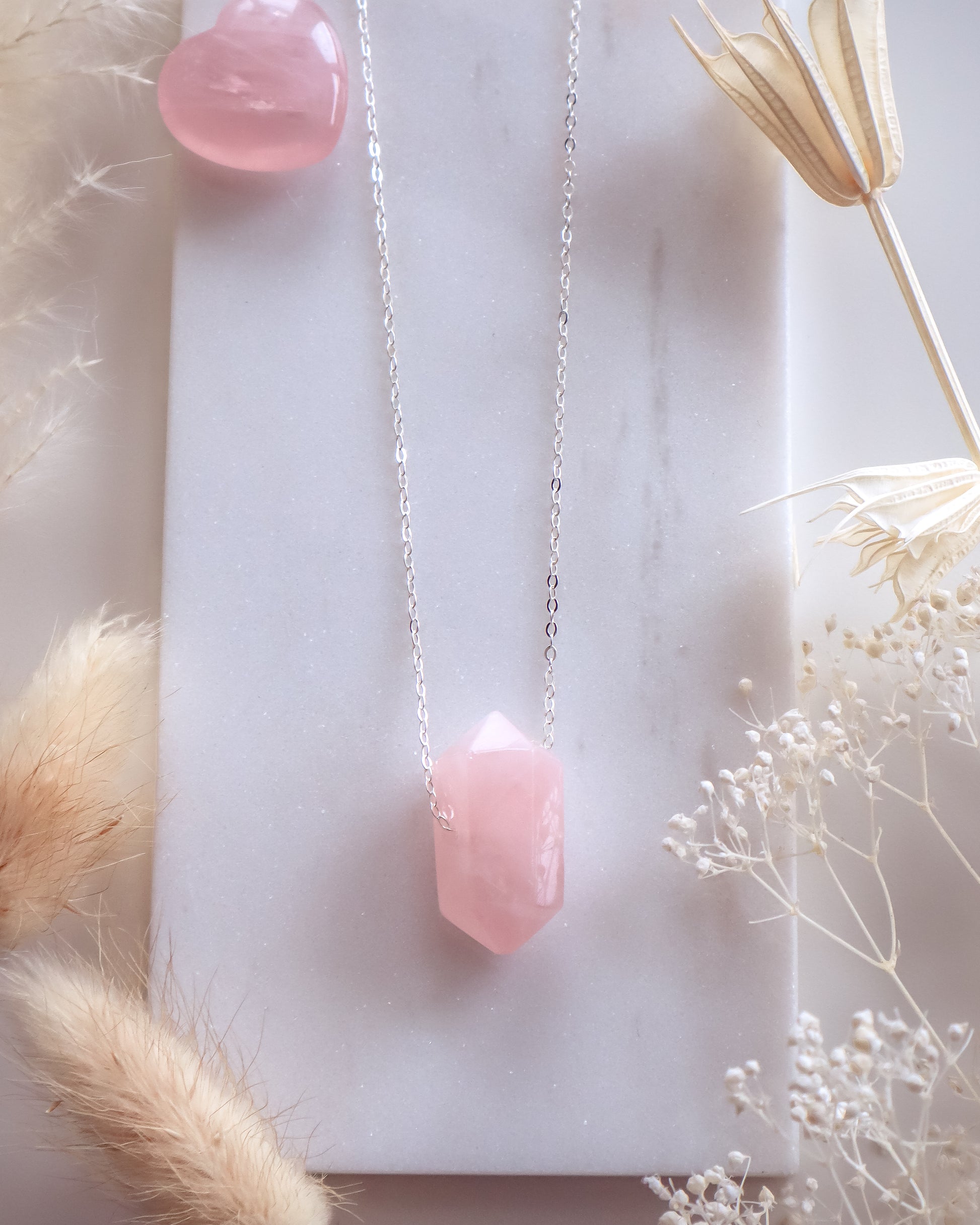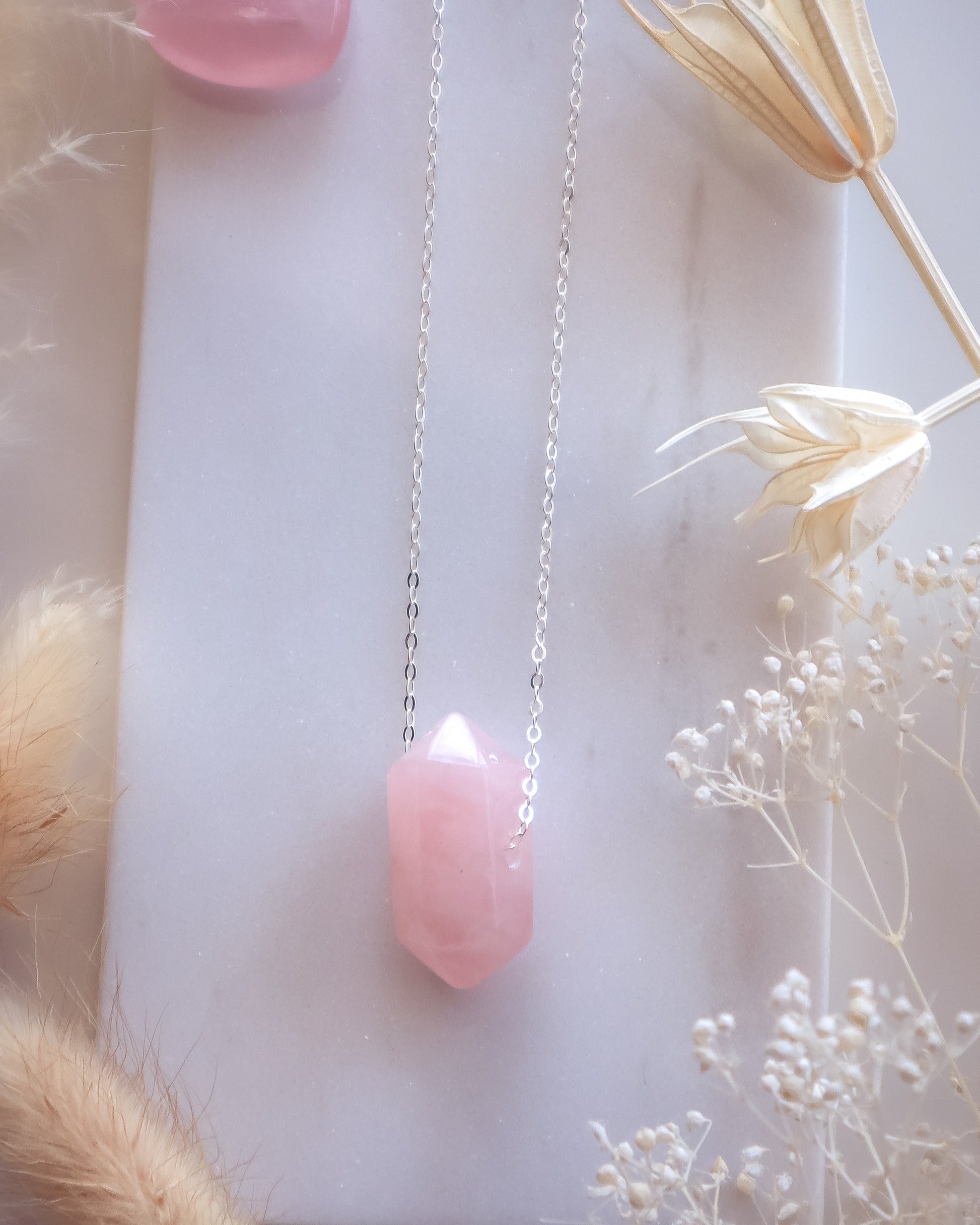 A double terminated rose quartz point on sterling silver chain. Measures 18". Closes with a lobster clasp in the back.