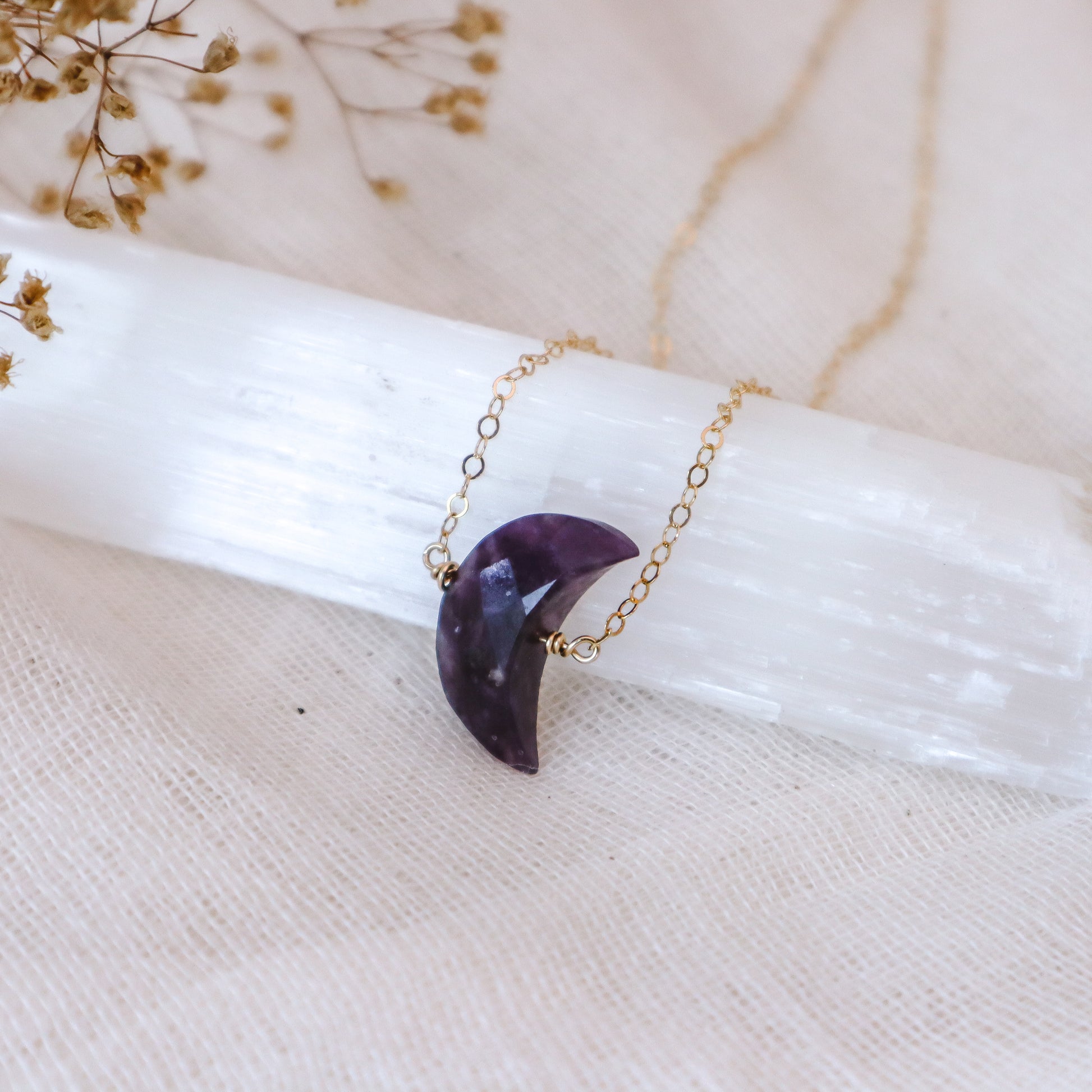 Beautiful lepidolite crescent moon necklace. Chose your length and metal (sterling silver, gold-filled, or rose gold-filled).