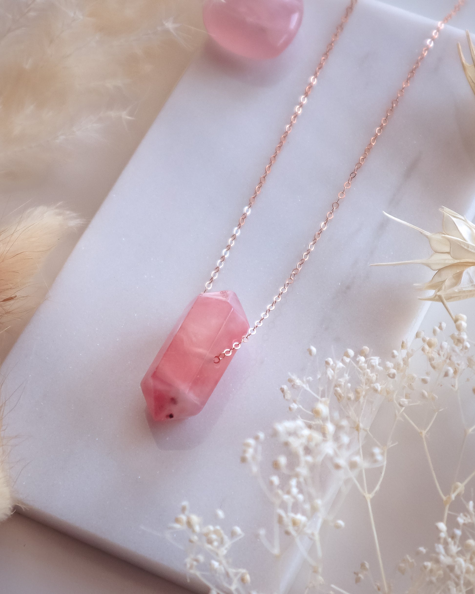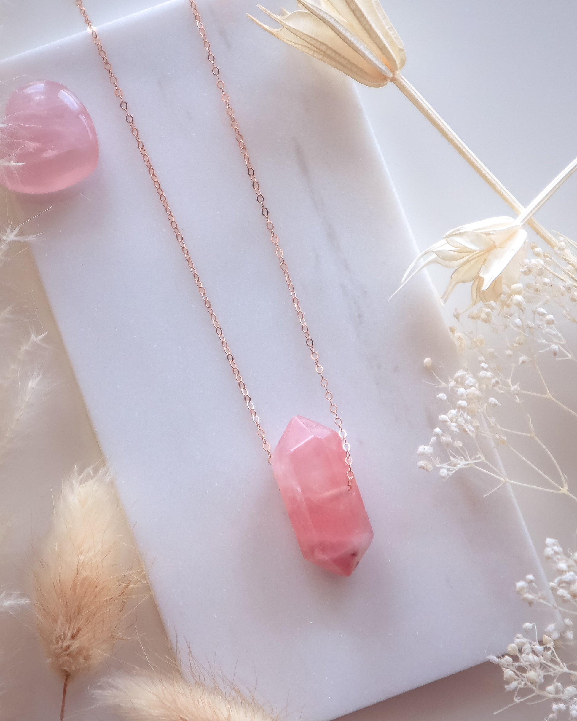 A double terminated rose quartz point on 14k rose gold-filled chain. Measures 18". Closes with a lobster clasp in the back.