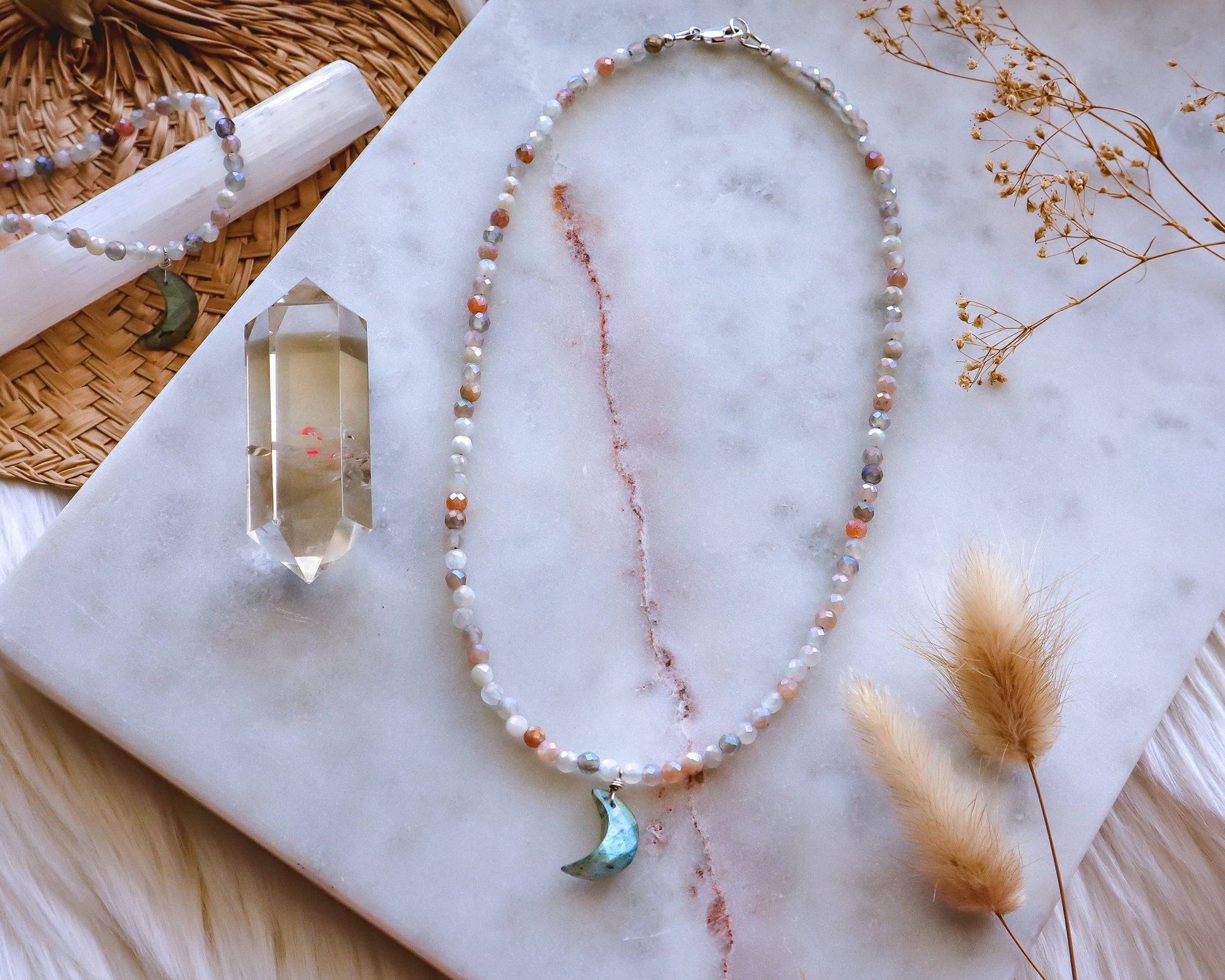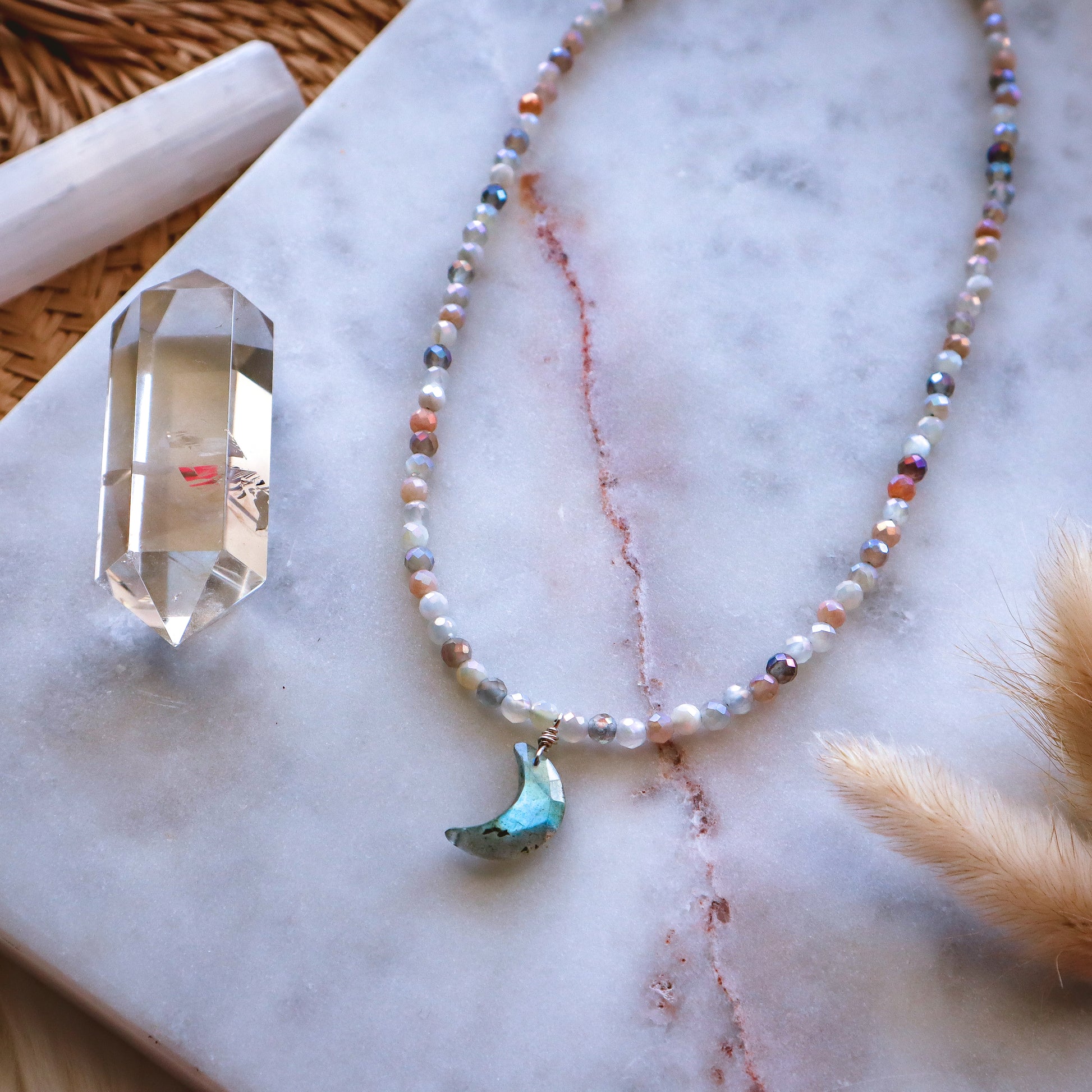Unique necklace made with a flashy, high-quality labradorite moon and 4.5mm aura, multi-colored moonstone. The beads have beautiful aura flash. All metal components are .925 sterling silver.