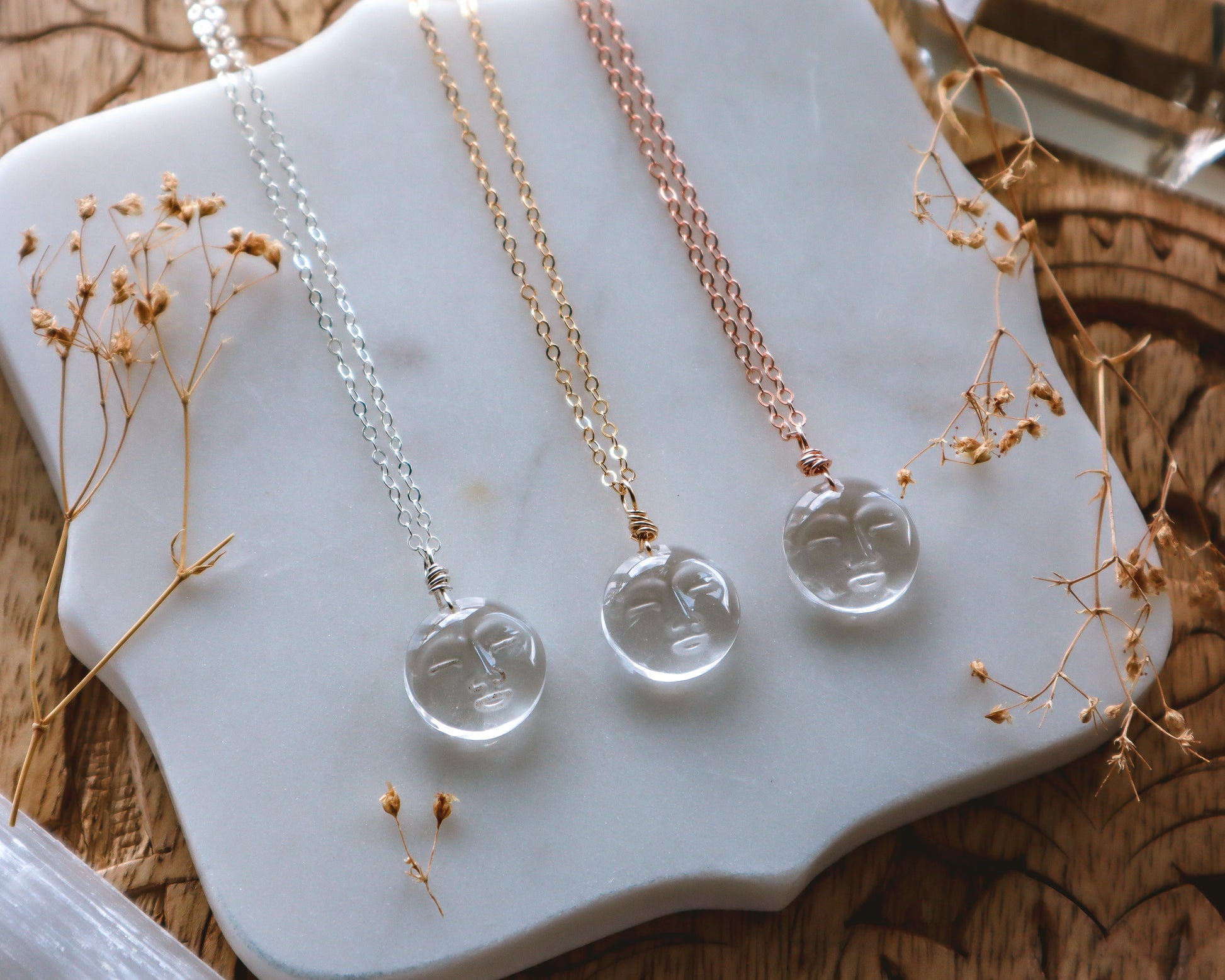 Mini Clear Quartz Moon Face Necklace | Choose your metal mop