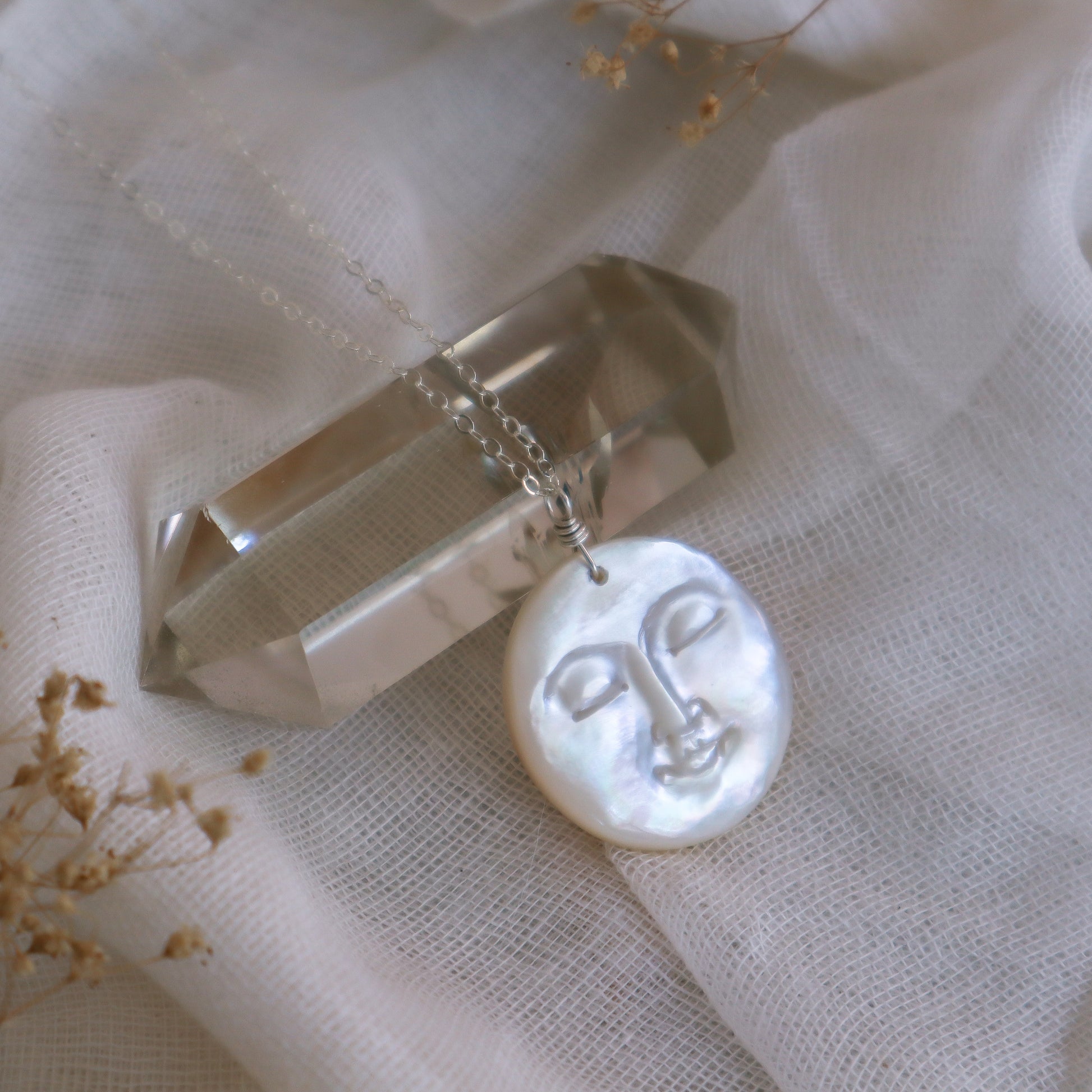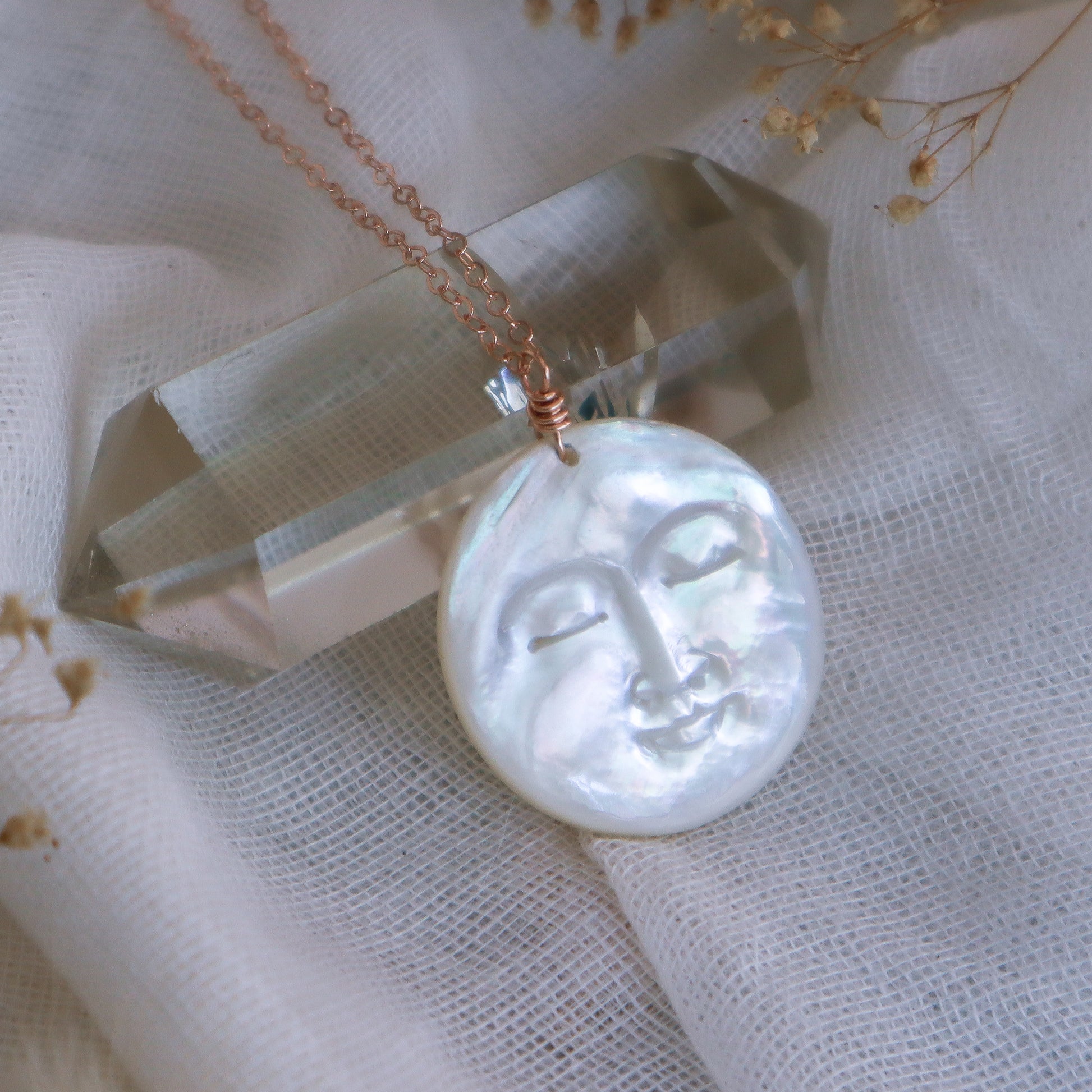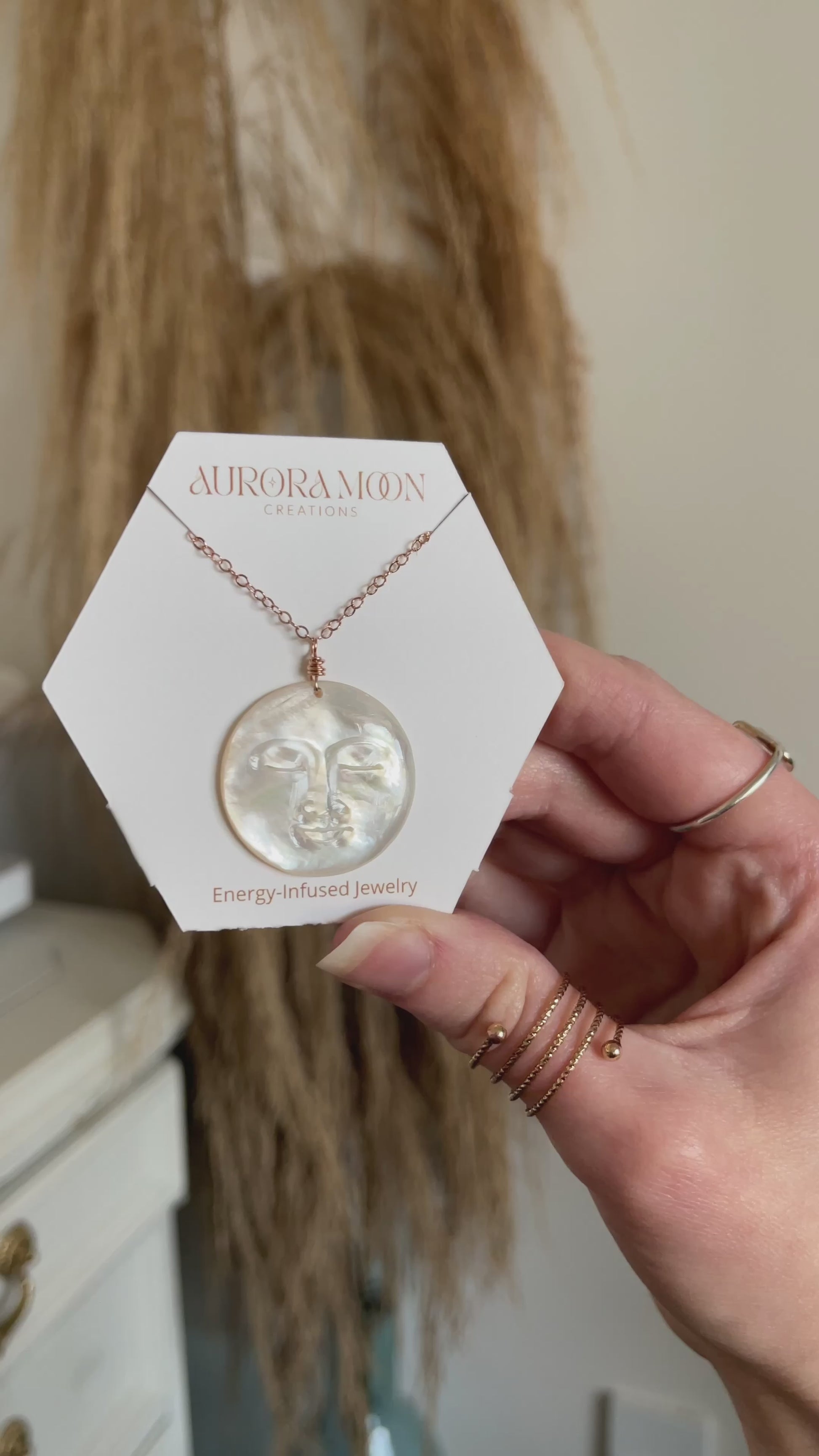 - Mother-of-pearl full moon, hand-carved by a top master craftsman in Bali. These pendants are each one-of-a-kind and have beautiful rainbow sheen.