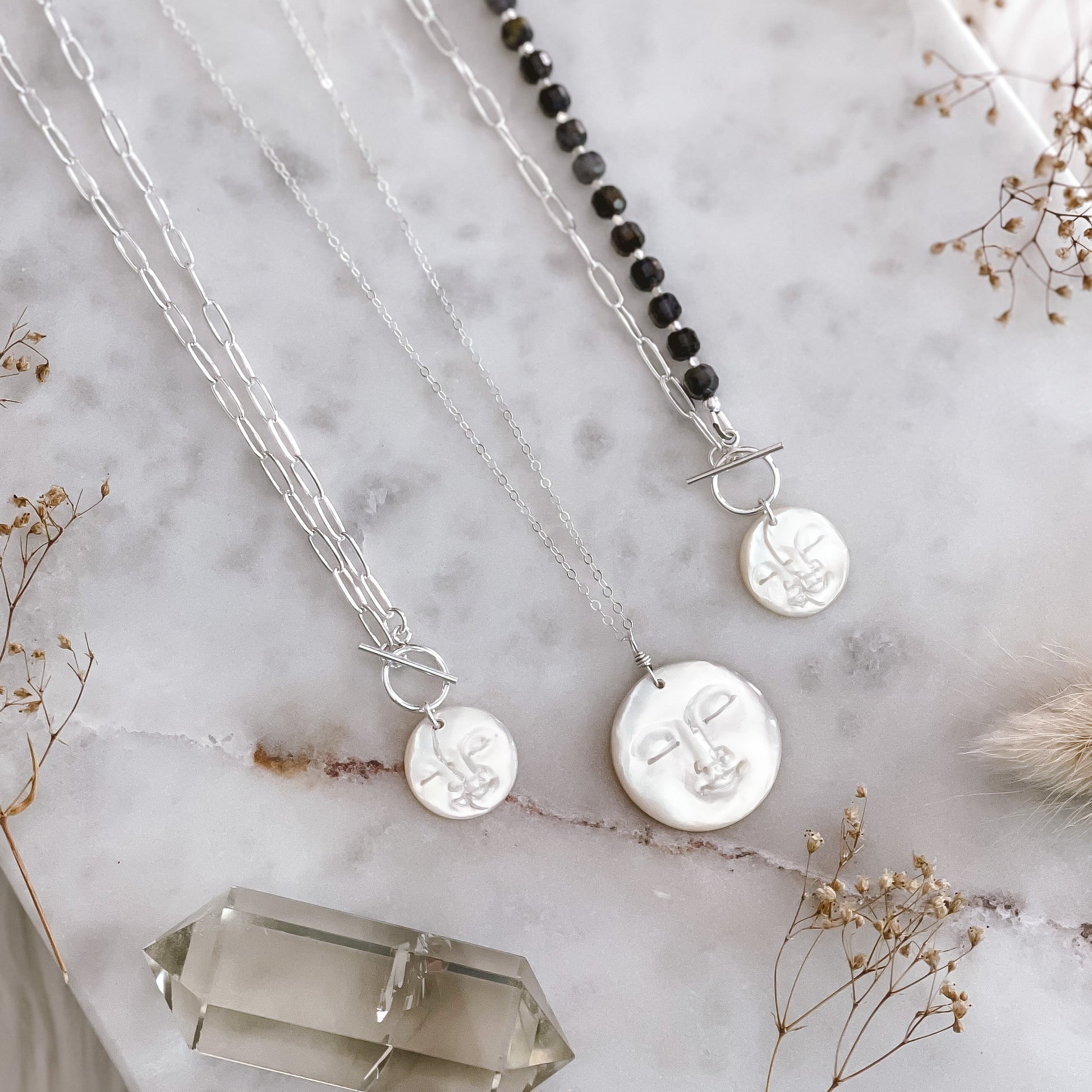 - Mother-of-pearl moon phase, hand-carved by a top master craftsman in Bali. These pendants are each one-of-a-kind and have beautiful rainbow sheen.