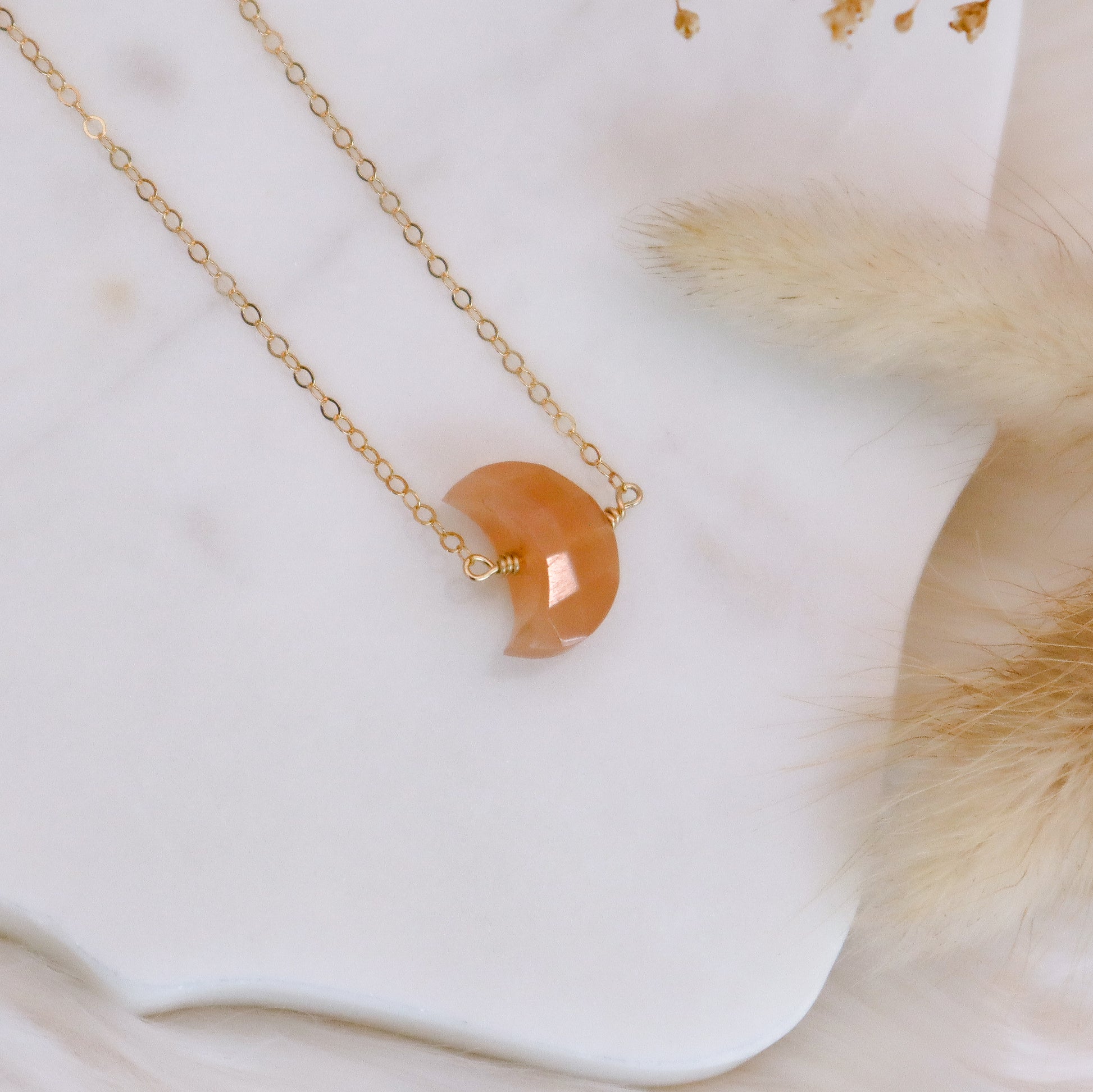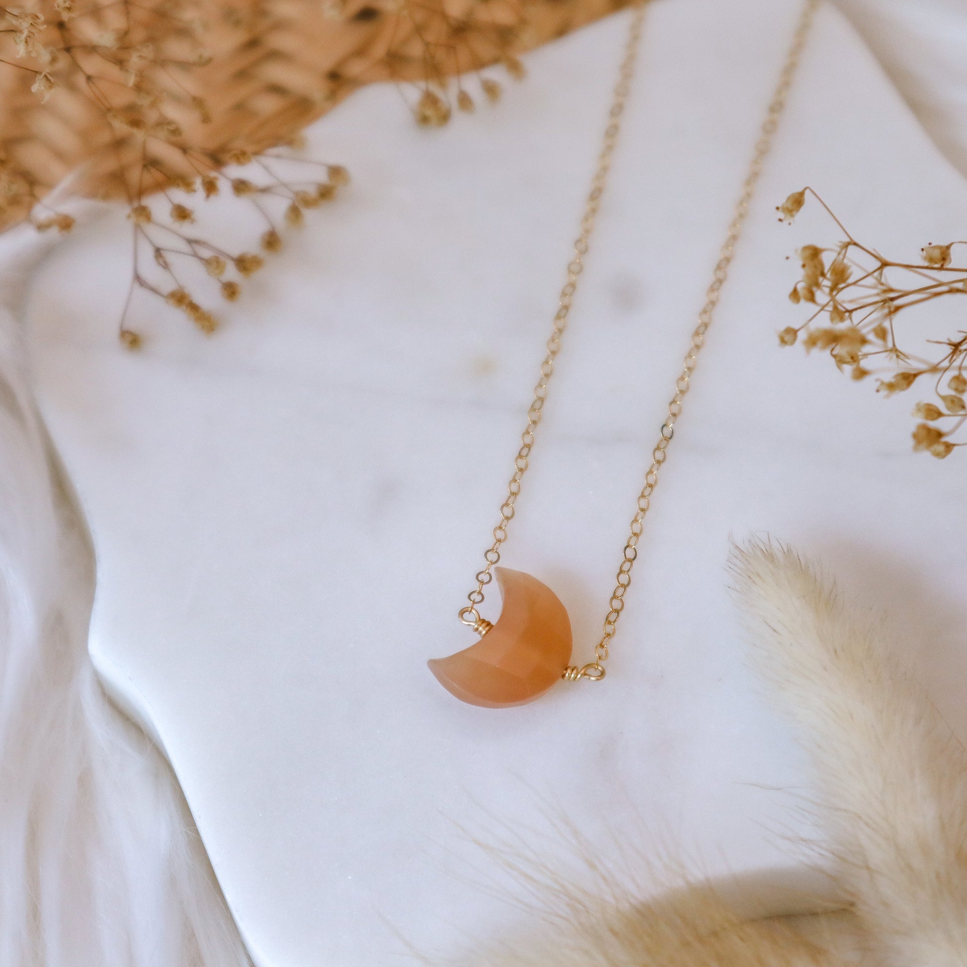 Beautiful peach moonstone crescent moon necklace. Chose your length and metal (sterling silver, gold-filled, or rose gold-filled).