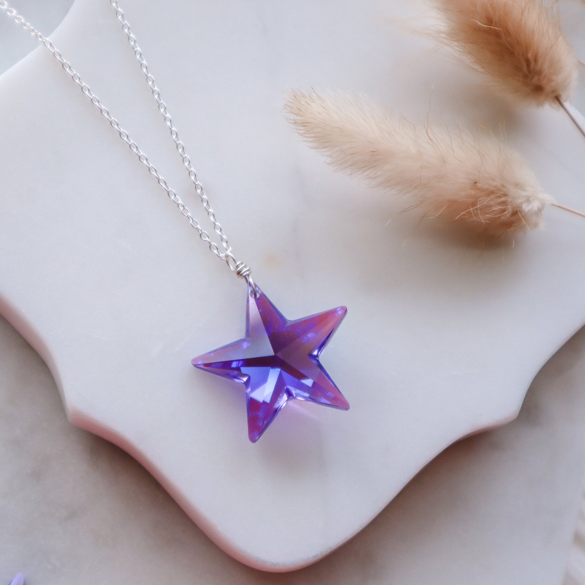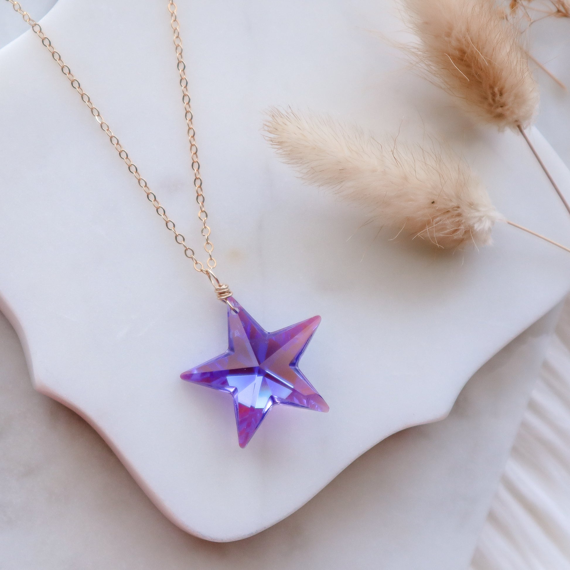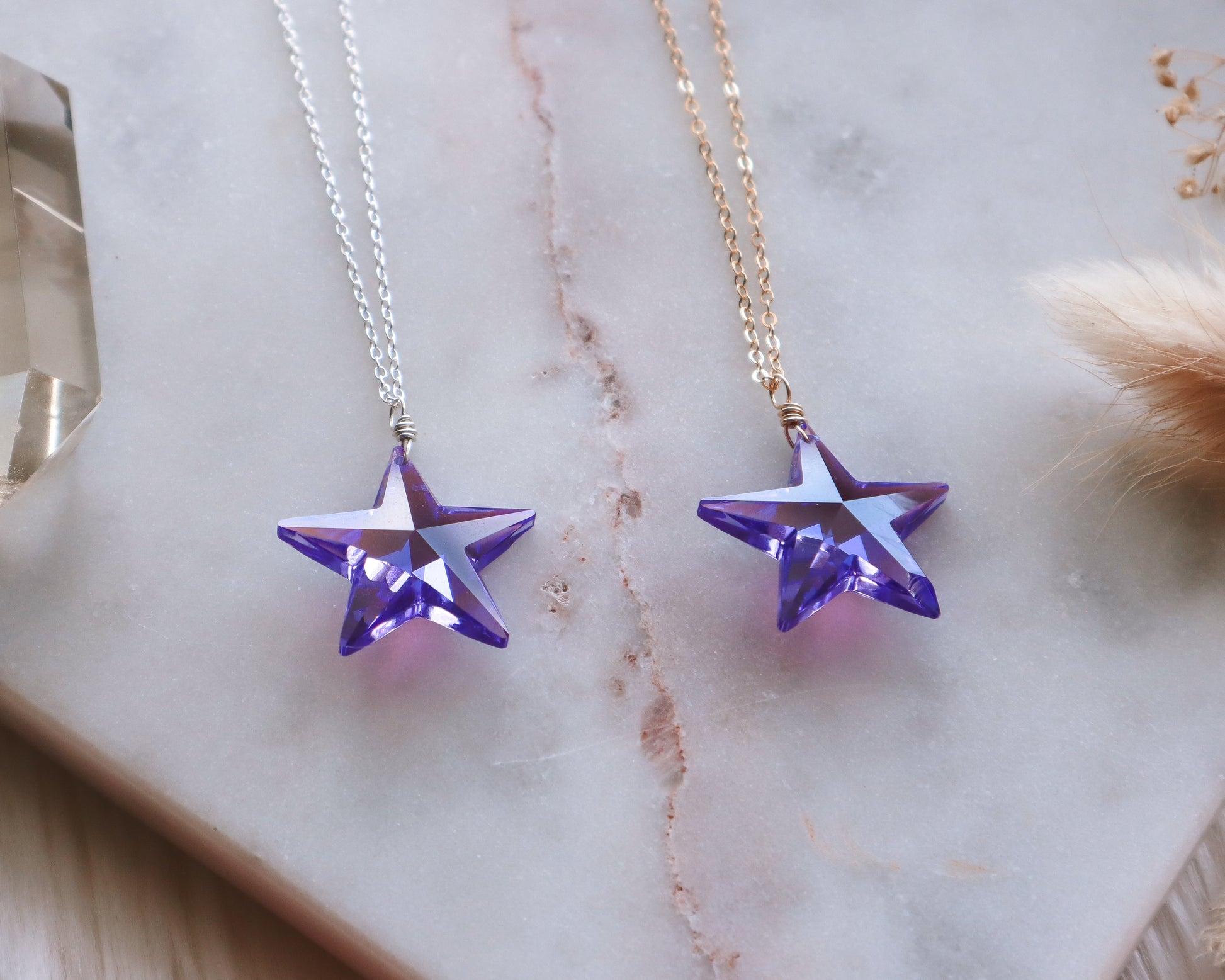 Genuine, high-quality Swarovski crystal stars on dainty chain. Chose your metal (sterling silver or gold-filled). These large stars are purple with a gorgeous Aurora Borealis coating. They dazzle like none other 😍