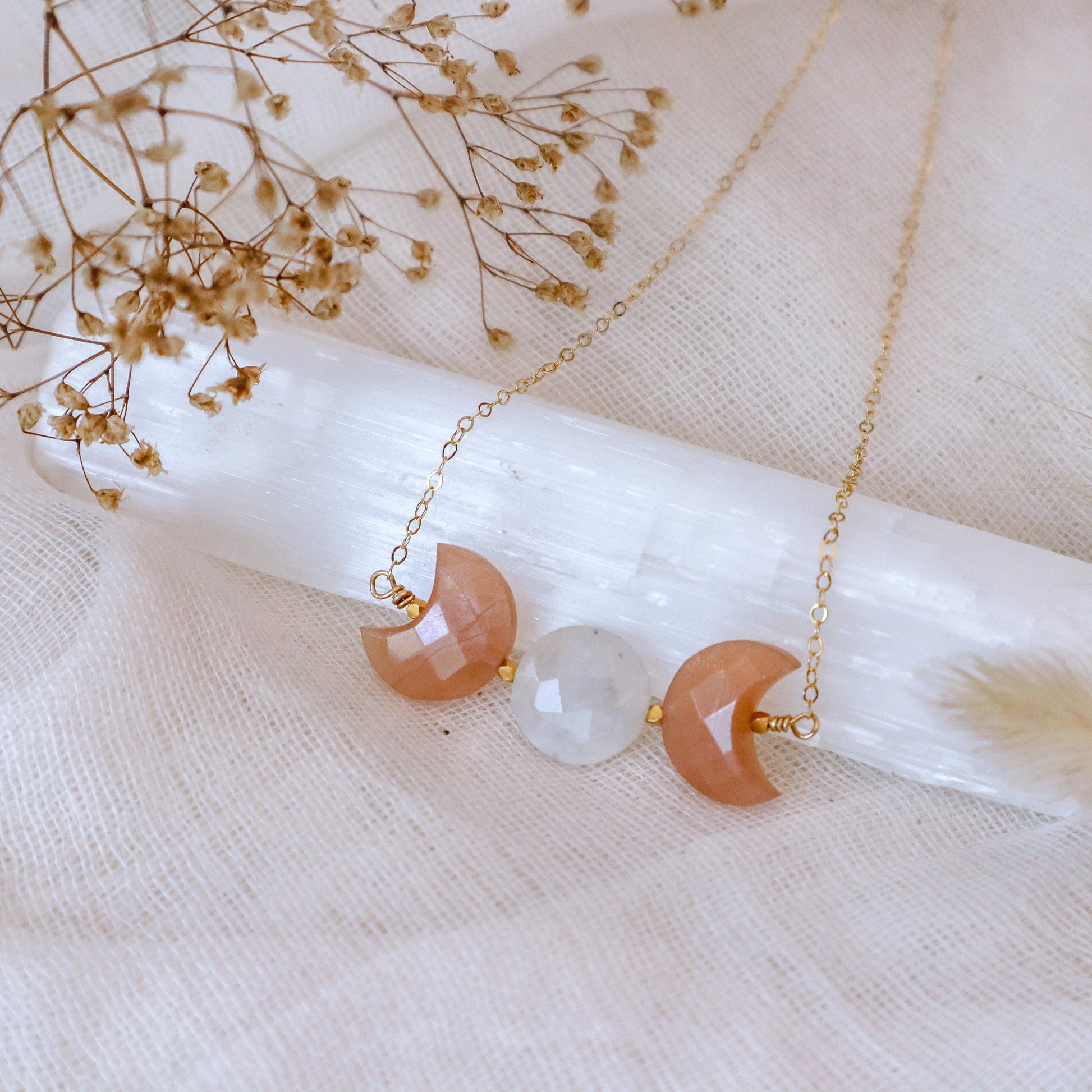 Triple Moon Goddess Necklace | Peach Moonstone | Choose your length and metal
